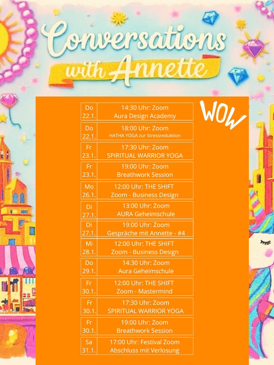 Was umfasst das Festival? 13 Sessions via Zoom: Aura Design Academy, Holy Scripts, Business Mentoring, The Shift Workshop, eine Breathwork Session und 4 Gespräche mit Annette (exklusive Zooms nur für Festival-TeilnehmerInnen), sowie einen Abschluss-Zoom mit Verlosung und Tagesimpulse in einer exklusiven WhatsApp Gruppe.